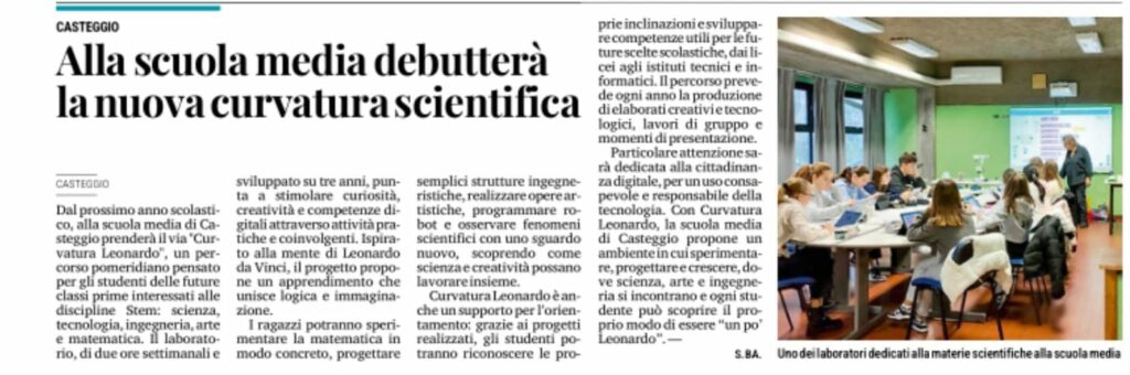 Ringraziamo il quotidiano La Provincia pavese per lo spazio dedicato alla nuova "Curvatura Leonardo", che sarà attivata dall'a.s. 2025/2026 presso la scuola secondaria di Casteggio. Si tratta di un nuovo percorso pomeridiano innovativo che unisce tutte le materie "STEAM" e completa l'offerta formativa della scuola secondaria di Casteggio: creatività artistica, esperimenti di scienze, potenziamento del pensiero matematico, laboratori di coding e robotica, attività multimediali e certificazione ICDL.