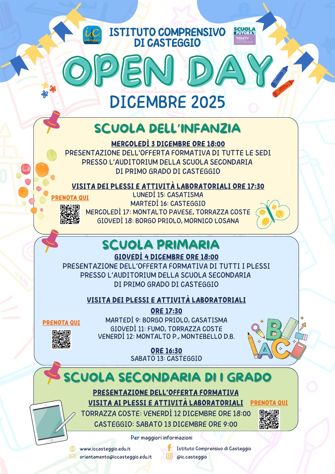 L’Istituto Comprensivo di Casteggio è lieto di invitarvi a partecipare agli Open Day che si terranno nel mese di dicembre 2025.